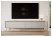 Szafka RTV z kolekcji Lisse to kwintesencja nowoczesnego designu z nutą elegancji. Charakterystyczne ryflowane fronty, zaokrąglone krawędzie oraz metalowe nóżki tworzą wyjątkowy mebel, który doskonale odnajdzie się w salonach urządzonych w stylu glamour, modern classic, japandi czy minimalistycznym.