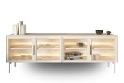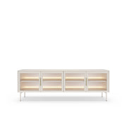 Hartowane szkło zastosowane na frontach nie tylko chroni zawartość półek przed kurzem, ale również umożliwia subtelną ekspozycję dekoracji, książek czy sprzętu RTV. Delikatne, ciepłe światło LED podkreśla głębię kolorów wnętrza mebla i nadaje pomieszczeniu wyjątkowy, przytulny charakter. To idealne rozwiązanie do salonu, szczególnie w strefie telewizyjnej.