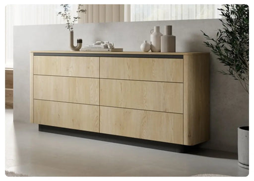 Komoda Telo C to wyważone połączenie prostoty i nowoczesnej elegancji w stylu japandi. Jasne fronty w dekorze dąb cremona subtelnie kontrastują z c...